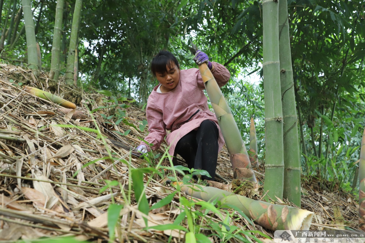 活动现场。通讯员 赵文朝 摄 本次庆丰节活动以“评‘笋王’ 品‘笋宴’ 庆丰收”为主题,当天的“笋王”评选活动是本次活动的焦点。一个个新鲜出土的竹笋被展示在评委和观众面前。评委们从笋的个头、色泽、外观感等方面进行综合评判,最终,平细村村民张宗银凭借一根长达1.21米、重达25.6斤的竹笋,从众多竞争者中脱颖而出,荣获“笋王”称号。 村民在采笋。通讯员 黄数情 摄 现场除了紧张刺激的比赛,还有令人垂涎的全笋宴。金腿玉笋、八渡金云、百花竞节等佳肴,每一道都巧妙融合竹笋的鲜美与当地特色食材,展现八渡笋多样性和独特风味。“第一次看到八渡笋还能做成这么多菜。”来自北海的游客张女士赞叹道,每道菜都有独特的口感,让人回味无穷。