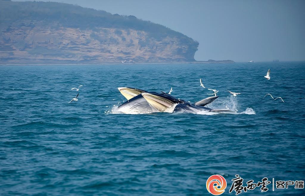 两头张嘴捕食的布氏鲸。(视觉中国供图) 优良的地理环境和丰富的海洋资源还吸引了地球上另一种珍稀精灵——布氏鲸的到访。幸运的话,出海时你还能看到部分滞留未归的布氏鲸:它们张开巨大的大口,将数吨小鱼小虾吞下,再潜入水中,喷出一条高达数米的水柱。这些可爱的精灵自古以来就与涠洲岛的渔民和平相处、相安无事,如今更成为涠洲岛独一无二的海洋生物资源,吸引着无数游客前来追寻。 |