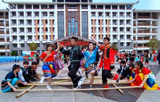 学生欢快地跳起竹竿舞。记者 凌聪/摄