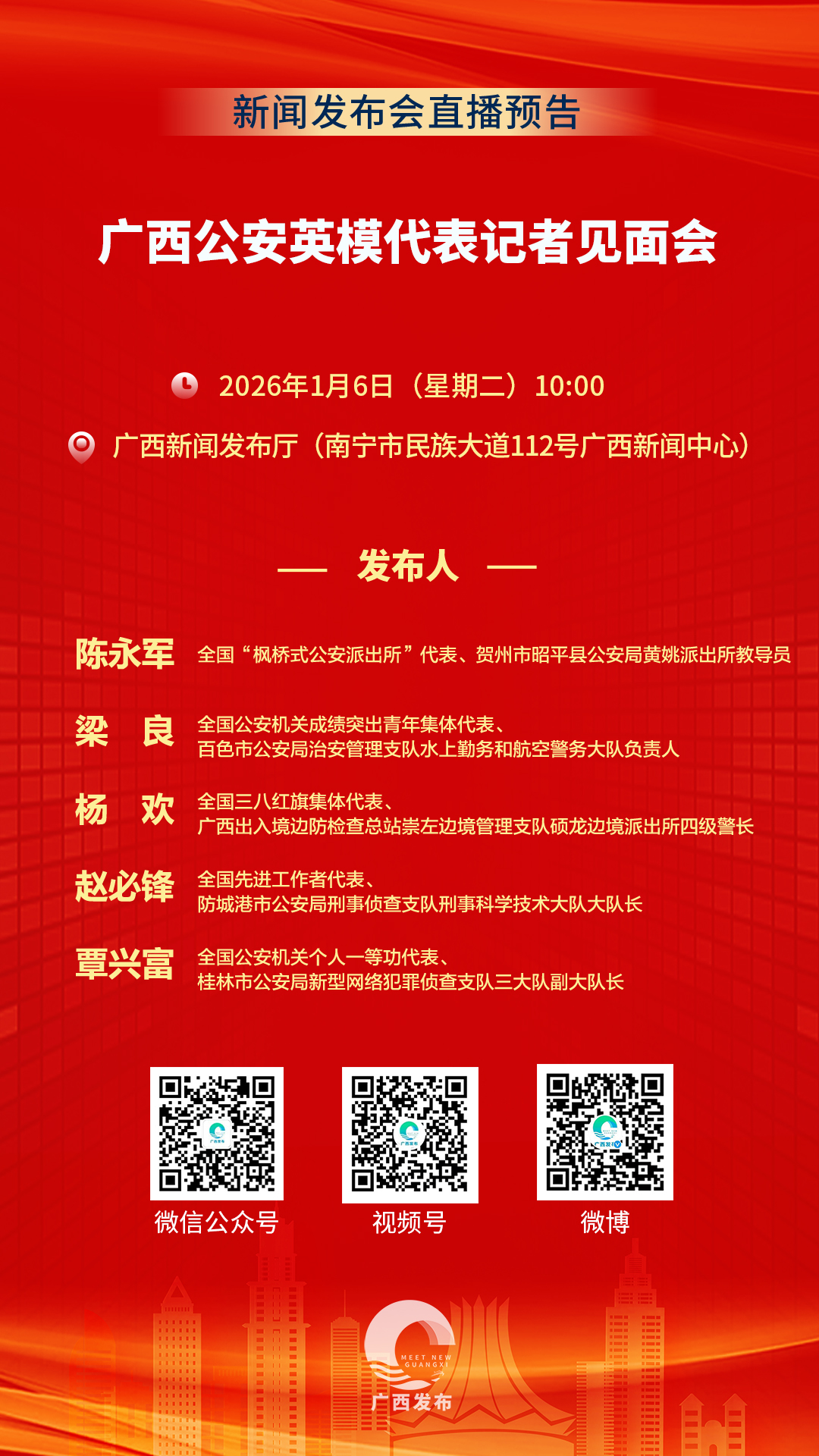 广西壮族自治区党委宣传部将于2026年1月6日(星期二)10:00,在广西新闻发布厅举行记者见面会,邀请全国“枫桥式公安派出所”代表、贺州市昭平县公安局黄姚派出所教导员陈永军;全国公安机关成绩突出青年集体代表、百色市公安局治安管理支队水上勤务和航空警务大队负责人梁良;全国三八红旗集体代表、广西出入境边防检查总站崇左边境管理支队硕龙边境派出所四级警长杨欢;全国先进工作者代表、防城港市公安局刑事侦查支队刑事科学技术大队大队长赵必锋;全国公安机关个人一等功代表、桂林市公安局新型网络犯罪侦查支队三大队副大队长覃兴富,分享他们的先进事迹并答记者问。欢迎媒体记者出席。