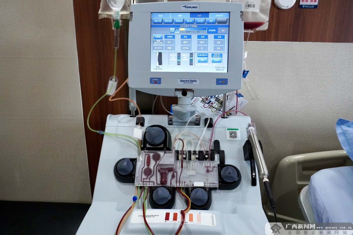 正在采集的造血干细胞,将为一名南非血液病患者带去生的希望。记者 陶昌顺 摄 “生命没有边界,希望用我的力量为他人提供生的希望。”吴先生觉得,造血干细胞不管献给谁,都是独特的体验,“我心里有种完成一项崇高事业的感觉,也更激励我以后继续做下去。” “他从18岁起开始献血,至今已献血100多次,去年还获得柳州市献血终身成就奖。”吴先生的妻子韦女士回忆,得知丈夫要捐献造血干细胞时,她最初很担心,后来得知现在采用类似献血的新技术,对身体伤害小,她便放下心来,支持丈夫的决定。“平时,他也会录视频发在社交媒体上,让更多人知道献血和捐献干细胞对身体没危害,还能帮助他人。” “此次非血缘造血干细胞捐献是中华骨髓库首例向南非患者实施捐献的案例。”中国造血干细胞捐献者资料库广西管理中心副主任冯晓春表示,截至2025年7月28日,中国造血干细胞捐献者资料库广西管理中心已实现非血缘造血干细胞捐献725例,其中境外捐献23例,为720多名血液病患者带去生命的希望。 |