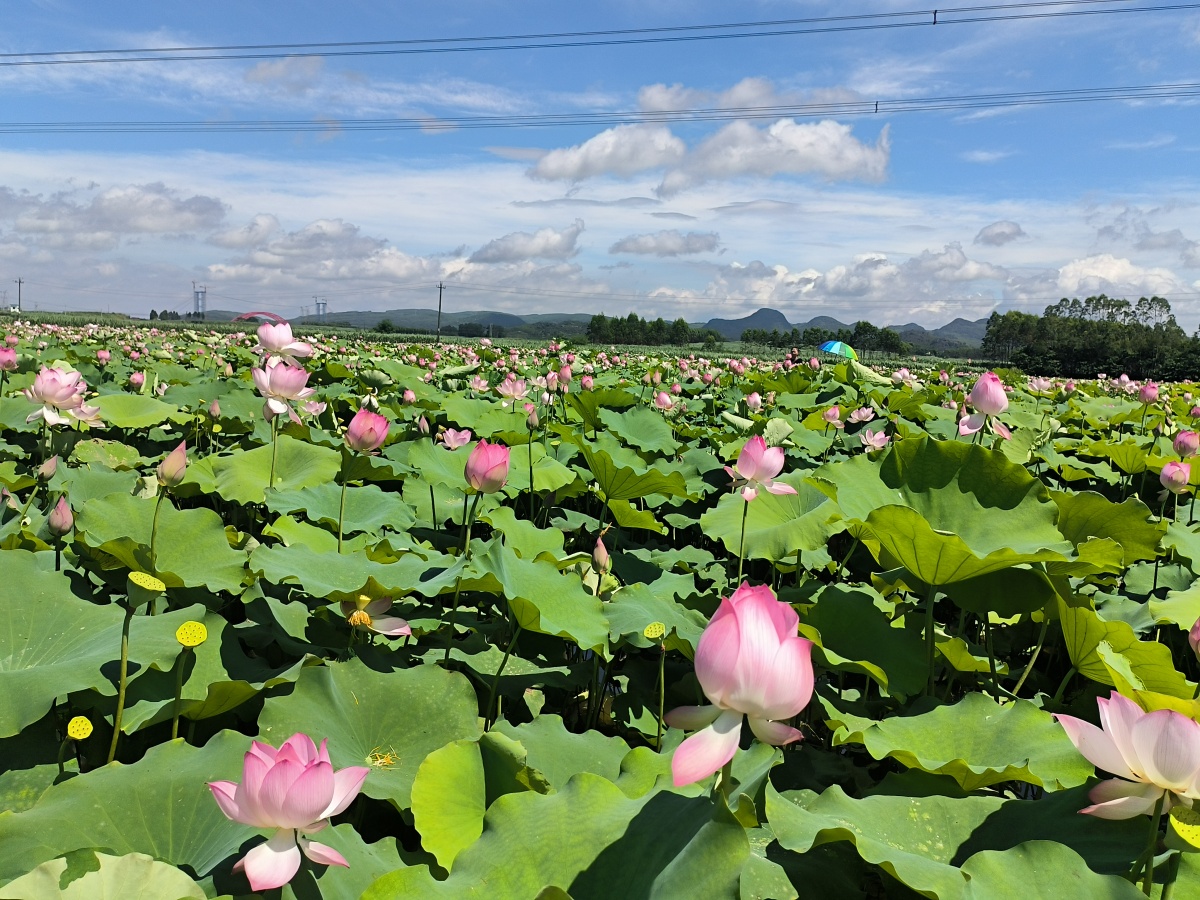 兴宾区良江镇塘权村莲花种植基地盛开的莲花随风摇曳。 从良江镇沿355国道往迁江镇方向,刚进入塘权村段,就可以看到路边莲花竞放,淡淡清香扑鼻而来,不少游客在田埂上拍照打卡。翠绿的莲叶铺满水面,一朵朵粉红的莲花亭亭玉立,随风摇曳,清香四溢。