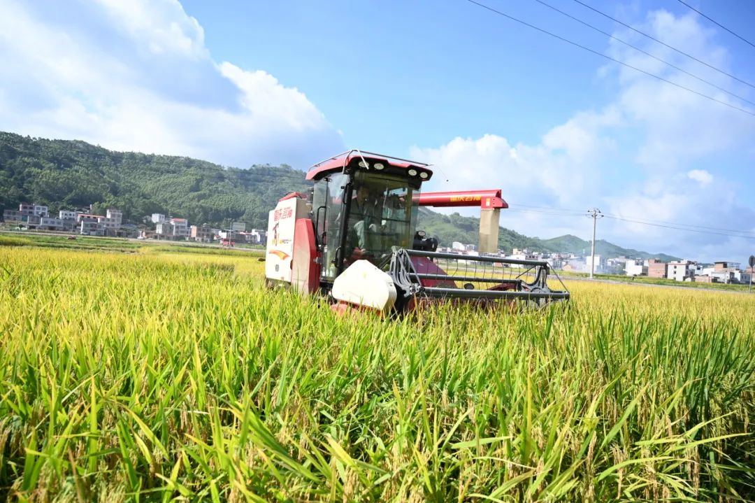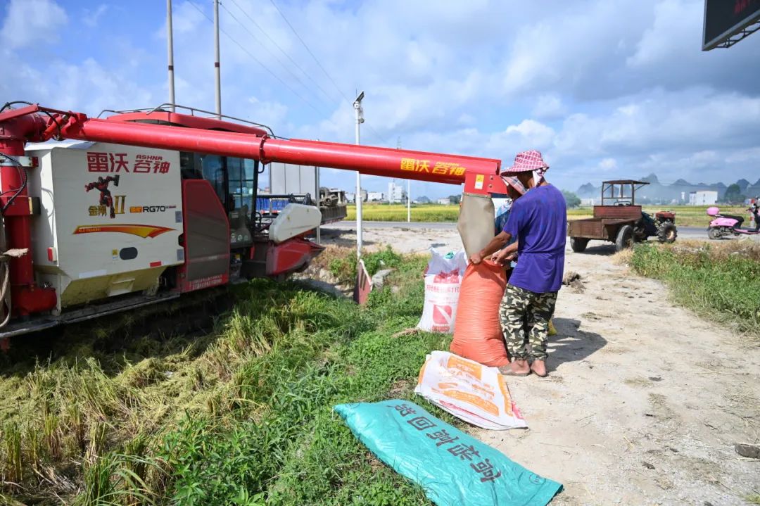 7月8日,武宣县通挽镇的田间地头,只见一片片金灿灿的稻谷映入眼帘,层层叠叠的稻穗颗粒饱满,散发着阵阵稻香。在这片希望的田野上,大量的人力和机械投入到早稻收割工作中。现代化的收割机开足马力,在田间地头来回穿梭,切割、脱粒、粉碎秸秆等一气呵成,奏响了丰收的乐章。大规模的机械化作业为早稻收割按下了“快进键”,极大地提高了收割效率,减轻了农民的劳动负担。