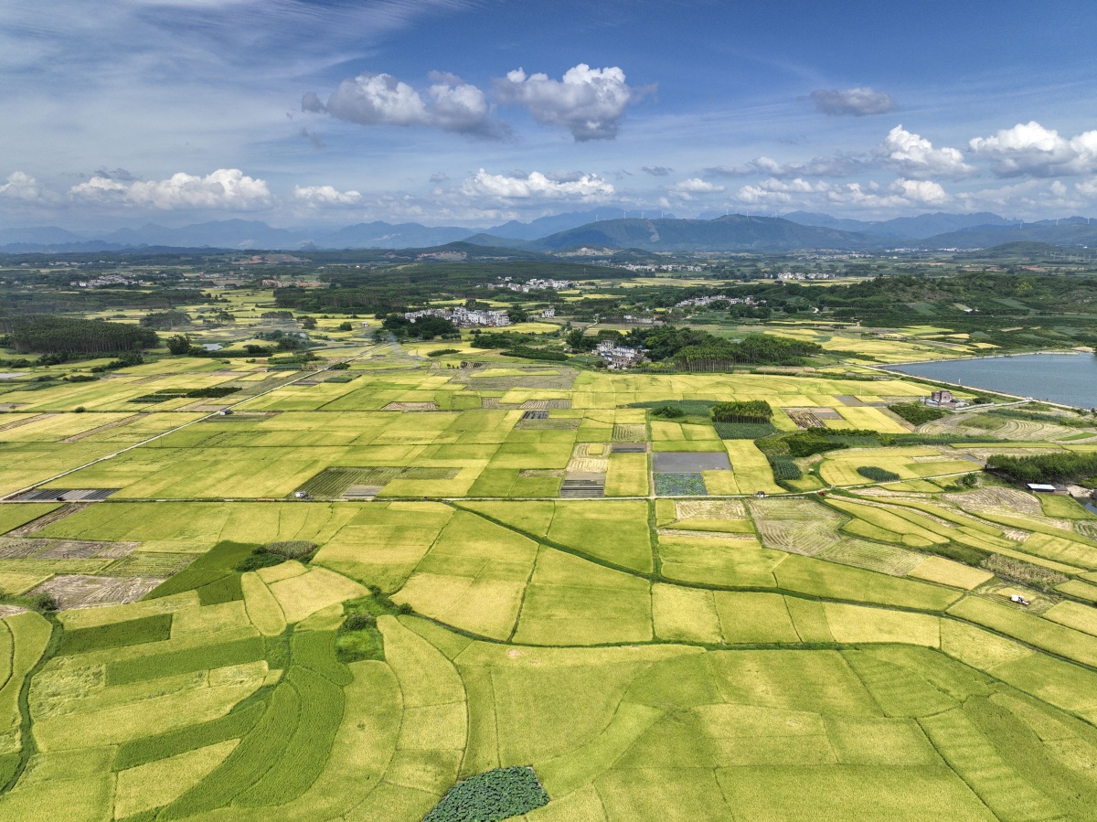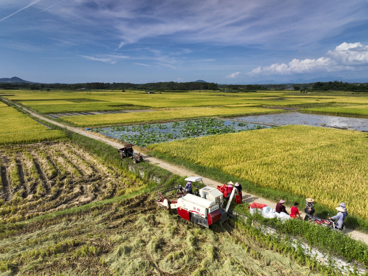 连片成熟的早稻。 7月9日,骄阳似火,在象州县水晶乡雷安村委百亩连片的早稻田里,一簇簇金黄色的稻穗随风摇曳,正等待收割。而在寺村镇谭村村委,数台联合收割机正在金色的稻田里“突突突”来回穿梭,开足马力抢收稻谷,收割、脱粒、装袋,一气呵成,村民们的脸上洋溢着丰收的喜悦。