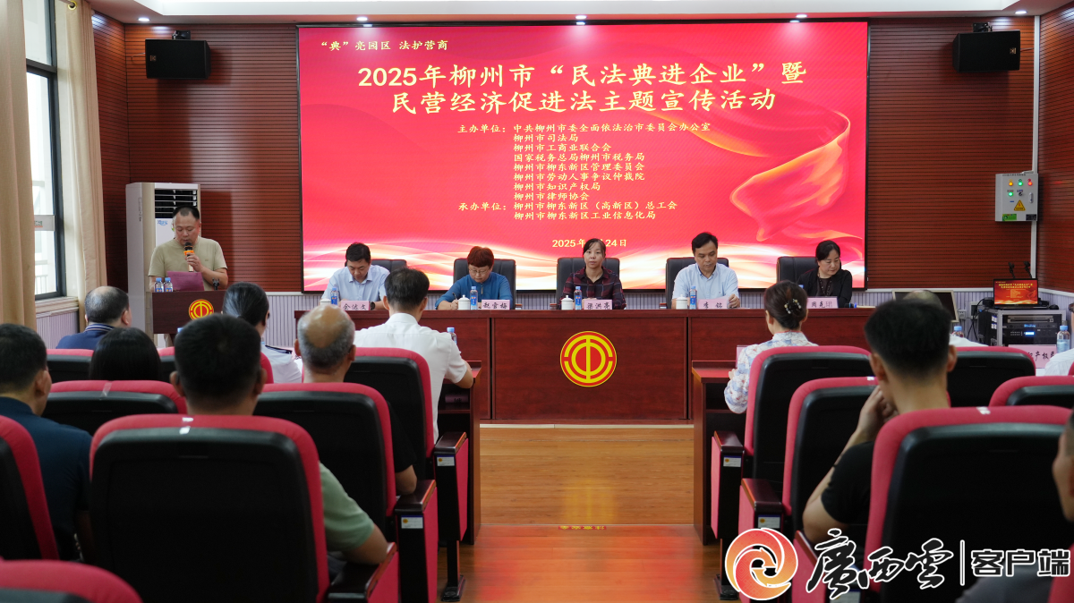6月24日,由柳州市司法局联合市工商业联合会、税务局等部门主办,柳东新区(高新区)总工会等单位承办的2025年柳州市“民法典进企业”暨民营经济促进法主题宣传活动在该市柳东新区举行,吸引了20多家企业、150余名职工代表积极参与。
