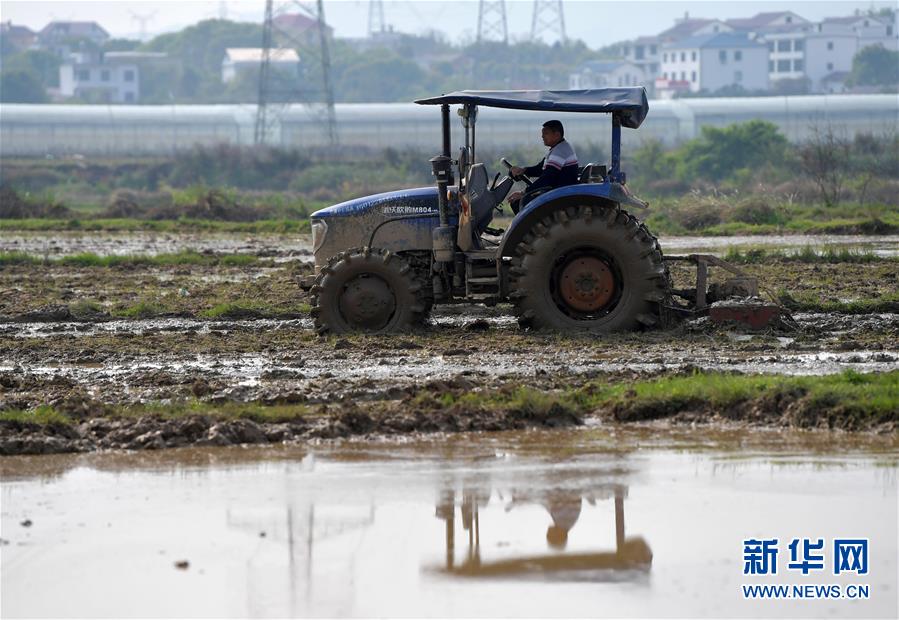 4月4日,南昌市新建区石埠镇农民在翻耕早稻田。 清明时节,江西省南昌市新建区各乡镇农民抢抓晴好天气,翻耕、播撒早稻种,加速进行春播工作。 新华社记者 彭昭之 摄