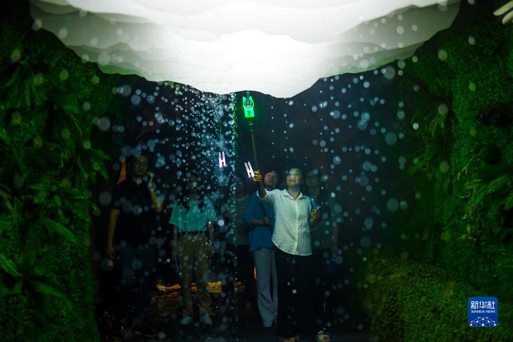 5月4日,游客在新昌穿岩十九峰景区夜游项目“山海经奇”中观赏洞窟雨滴。 近年来,浙江省绍兴市新昌县引入小吃集聚区、景区夜游、水幕电影等夜经济项目,带动当地旅游经济发展。据统计,“五一”期间新昌县累计接待游客92.49万人次,实现旅游收入约3.4亿元。 新华社记者 翁忻旸 摄