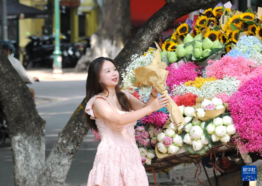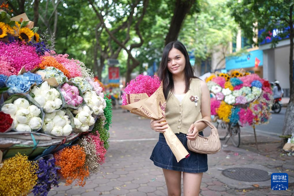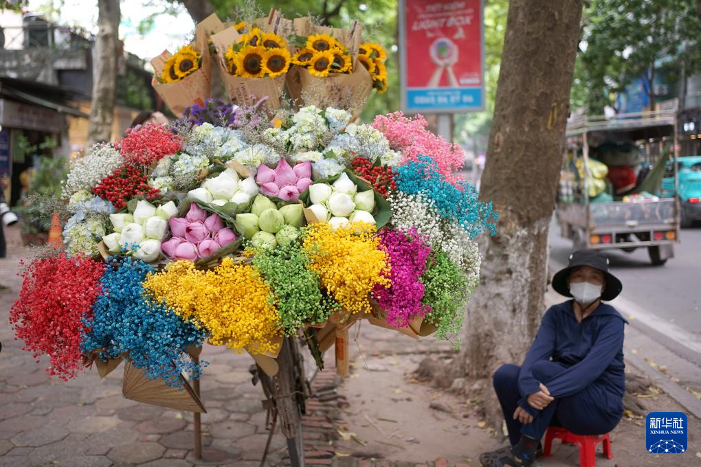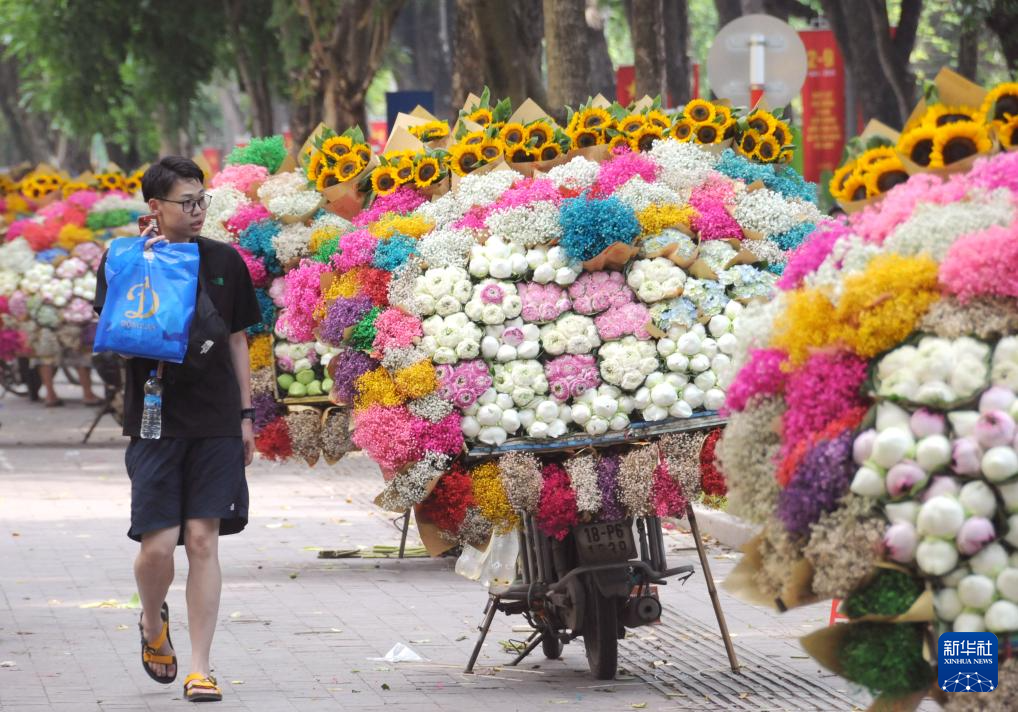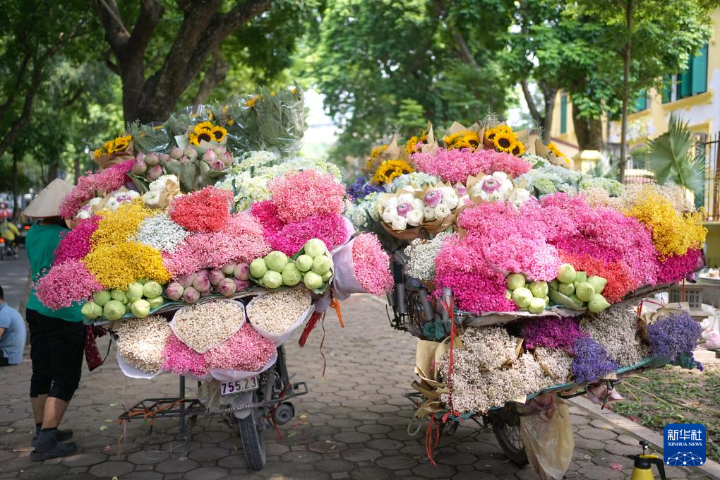 8月16日,越南河内的一条街道上集聚多个鲜花流动摊。新华社记者 刘天 摄