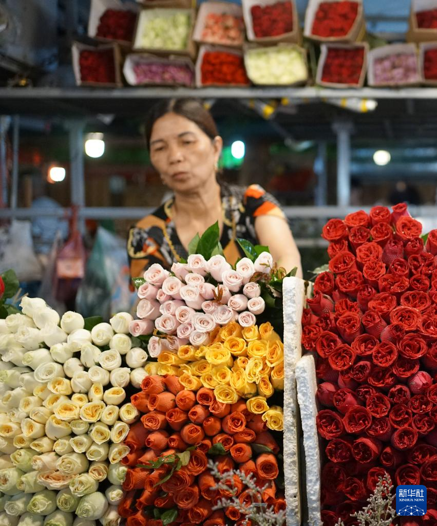 8月15日,在越南河内的鲜花批发市场,花商整理待售的鲜花。新华社记者 胡佳丽 摄