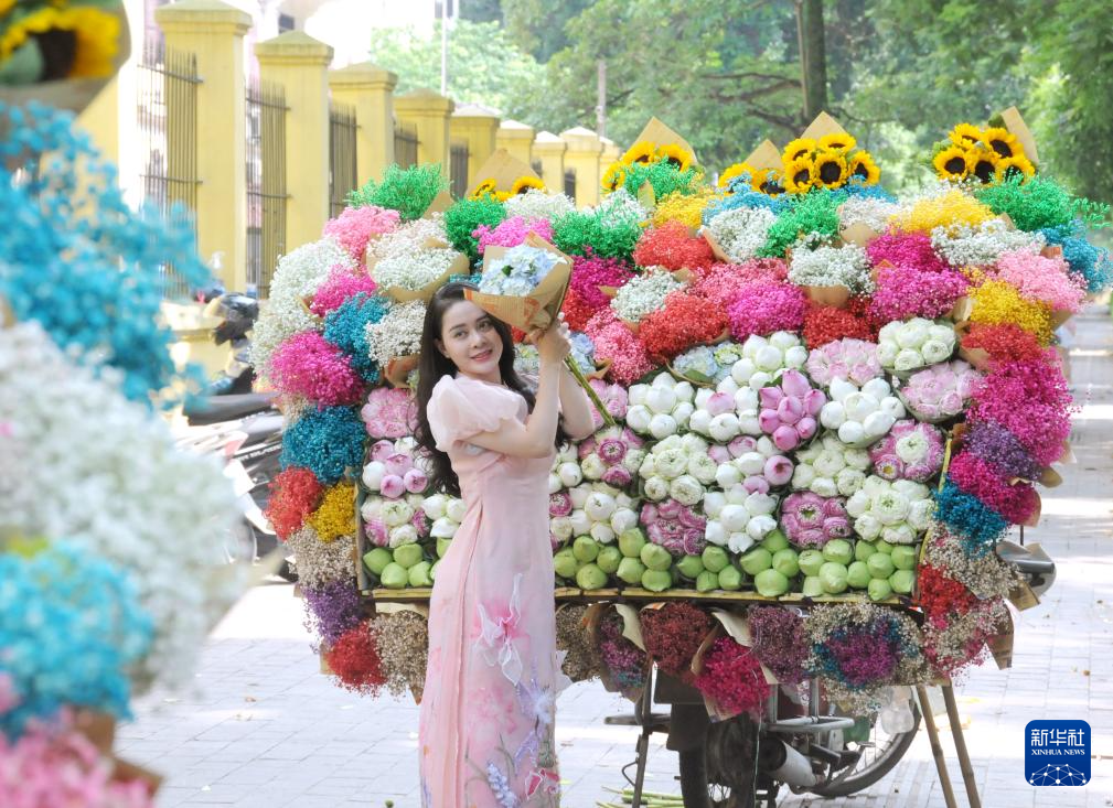 8月16日,一名身着奥黛的越南女子在河内街头一处鲜花流动摊前留影。新华社记者 刘天 摄 越南首都河内是一座爱花的城市,夜晚的鲜花批发市场车水马龙,白昼里的卖花流动摊遍布大街小巷,多彩的鲜花点缀了河内的旖丽风光。