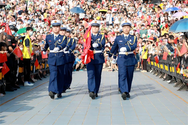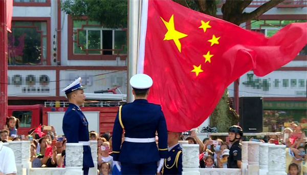 升国旗仪式上,英姿飒爽的县消防大队国旗护卫队队员精神抖擞地迈着正步,护卫着鲜艳的五星红旗来到旗杆下,在庄严的国歌声中,鲜艳的五星红旗冉冉升起。大家怀着崇敬激动的心情,向国旗行注目礼,唱国歌,向国旗、向伟大祖国致敬。升旗仪式后,全体人员同唱《歌唱祖国》,用歌声祝福祖国繁荣昌盛。