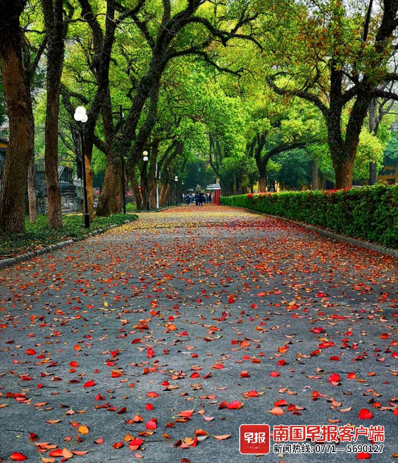 ▲桂林王城景区里的落叶。南国早报全媒体记者 唐晓燕 摄 在桂林市区滨江路、漓江路、七星路、中山南路、凤北路等路段广泛种植的香樟树,是桂林的乡土树种。每到春天,飘落的香樟叶早已锁定一席之地,尤其在“落叶缓扫”的王城景区里,樟树落叶的美景令人流连忘返。
