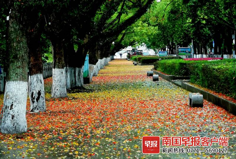 ▲桂林滨江路的樟树落叶缤纷,美不胜收。李腾钊 摄 据介绍,树木在春天落叶能延长光合作用时间,有利于新叶的迅速生长,进而为春天的生长储备更多的能量。“叶陪树度过了寒冷的冬而凋零,芽迸发舒展了生机的春而成长。”在桂林人的朋友圈里,记录着这反季节的美丽。