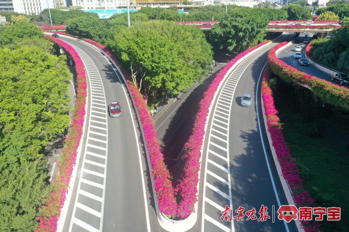站在高处放眼望去,视线范围内均能看到粉色花朵,道路两旁、立交桥上随处可见一抹抹“浪漫粉”,令人心旷神怡,忍不住想驻足拍照打卡一番。