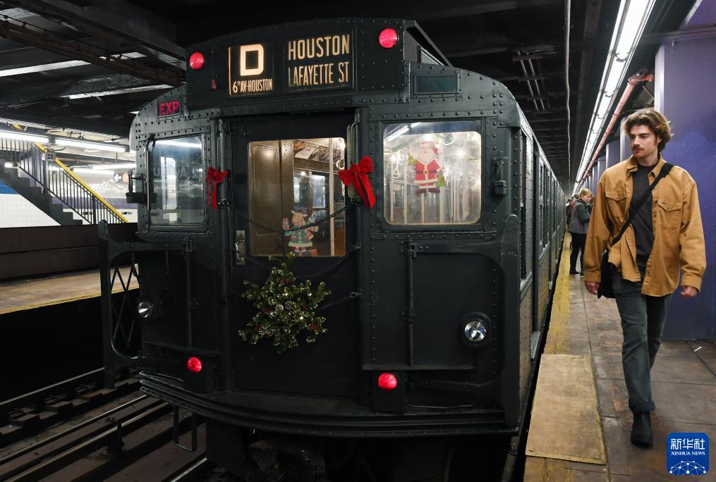 12月2日,在美国纽约,一名男子从“怀旧地铁”专列旁走过。 当天是纽约“怀旧地铁”专列2023年首次运行的日子,不少人前来搭乘这趟列车,体验时光回溯的奇妙感觉。今年的“怀旧地铁”专列由8节1932年至1977年间使用的车厢组成,运行路线为纽约曼哈顿第二大道站至145街站,运行时间为12月每个周六的特定时间。 新华社记者 李睿 摄