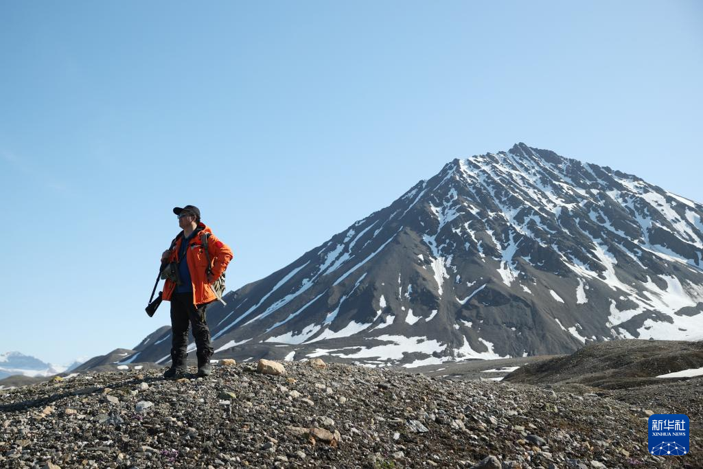 6月22日,在挪威斯瓦尔巴群岛,科考队员、黄河站站长胡正毅向冰川进发途中休息。