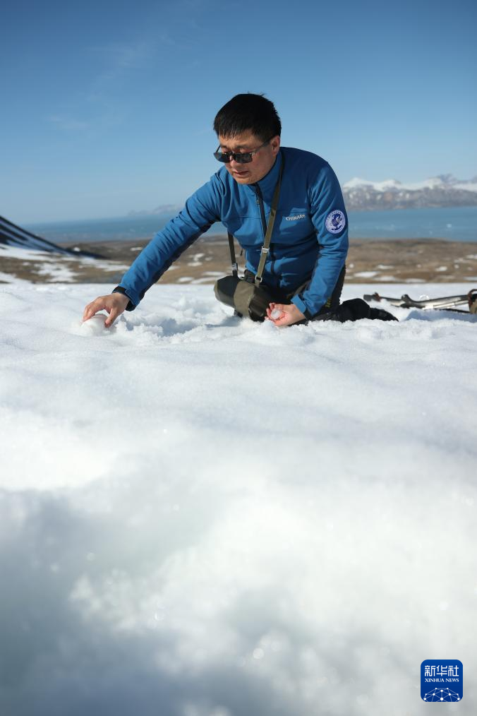 6月22日,在挪威斯瓦尔巴群岛,科考队员、黄河站站长胡正毅在东洛文冰川进行采样。
