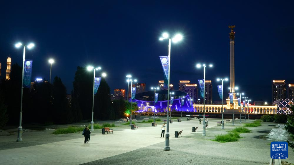 这是7月2日在哈萨克斯坦首都阿斯塔纳拍摄的独立广场上的纪念柱(右后)。