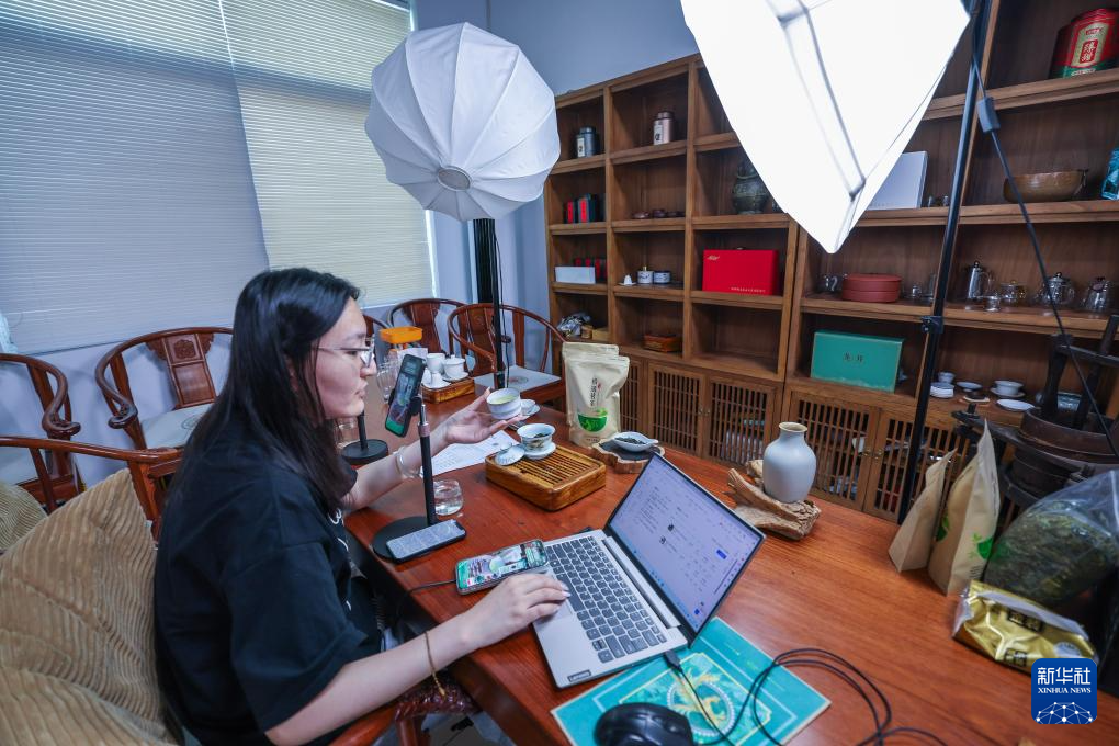 8月11日,云玺茶叶共富工坊的直播间内,工作人员在直播销售茶叶。新华社记者 徐昱 摄 |