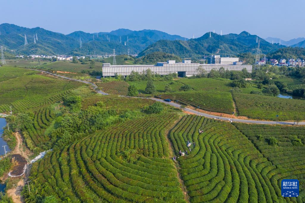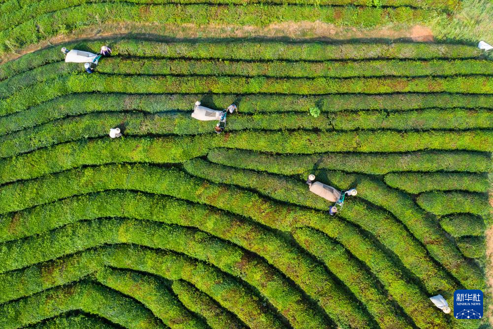 8月11日,茶农操作采茶机在茶山上采收夏茶(无人机照片)。新华社记者 徐昱 摄
