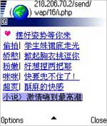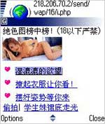 以上图片均来自IT.com.cn(IT世界) —————————————————————— “现在连手机上网都有黄色内容。”市民陈先生告诉记者一个手机WAP网站。在这个网站,上百张淫秽的图片、视频可供在线浏览和下载。警方表示,他们将会对黄色WAP网站进行查处,并欢迎市民举报类似黄色WAP网站。 根据陈先生的介绍,记者用全球通号码的手机打开这个后缀名为dwap.cn的WAP网站,进入“公告”,点击“成人专区更新”,网页上显示点击次数为7124次。进入成人专区,情色小说等栏目有十几个。“激情地带”内的“成人图片”中有近百张图片可以下载观看,其内容都是姿态淫秽、暴露的女性人体。而在“欲望图片类”内,有160多个几百KB大小的视频文件可以免费下载,内容是淫秽暴露图片。此外,该网站还可以链接到国外的黄色WAP网站。【详细】 ——————————————— 第一招:群发短信传播黄色网址 “在WAP网页上散布这些发布淫秽内容,一般用短信方式群发网址”,一位知情人介绍说,“下载一张图片大概只需2元左右,很多人都觉得好奇就下载‘玩玩’。” 第二招:冒充亲友骗你没商量 当你收到一个陌生号码发来的一条短信:“这么久都不见你,到哪里去了?快给我回个信息!”一时想不起对方是谁,你回了一条短信:“你是谁?”回复短信很快来了:“你已经申请成功,请输入注册名!”于是,你就无端端当上了黄色网站的会员。 第三招:利益诱惑让你掉陷阱 陈先生接到以手机入户通信公司名义发来的一条短信,称若回复就有可能中大奖,可以到各大名胜景点旅游,他心动了,立即回复,回复后就被套进黄色网站。 ——————————————— 红豆网友"无心去跑"支招: 不得不看,垃圾短信全方位评析,推荐解决办法 最近收到多封读者来信询问:“我的手机经常收到一些莫名其妙的短信,主要是一些商家的广告、业务推荐,甚至是办理假文凭的信息,严重骚扰了我的正常生活,请问遇到这种情况应该怎么办?”就这个问题我报组织了一个专题,现将相关结论汇总给用户。 为手机安装防火墙软件。现在有一种手机防火墙的客户端软件,用户安装后,可以根据黑白名单等关键字和号码段的设置,来自动拦截垃圾短信,非常实用。这也是在如今垃圾短信满天飞的情况下,用户自我保护的一种很好的办法。该类软件我们推荐信安易卫士手机防火墙,拦截垃圾短信非常有效,可以主动到网络找找其相关的信息,该软件免费下载和使用。【更多】
