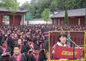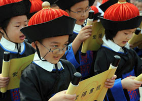 南宁市新阳路小学以“知书达礼,孝亲尊师”为主题,打造了一个颇具古典色彩的开学典礼。全校学生在“正衣冠”仪式之后,开启“朱砂启痣”仪式。老师们捧过鲜红的朱砂和软笔,在孩子们的额头正中点上红痣。原来,“痣”通“智”,意为开启智慧,以此寄托对新生们的美好祝愿。