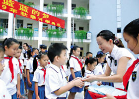 萧山实验小学的983名学生在新学期开学典礼上,每人都收到了一份“大礼”——心型愿景卡,上面写满了家长和老师经过精心准备的新学期的爱心祝愿。