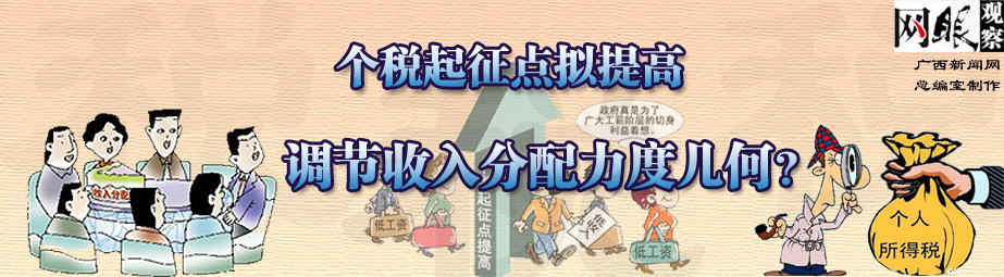 4月20日,全国人大常委会审议了个人所得税法修正案(草案),拟将个人所得税工资薪金所得由现在的每月2000元上调至每月3000元;将现行的9级超额累计税率修改为7级。 专家:个税起征点拟提至3000元与广西民众收入适应 个人所得税起征点拟上调至3000元、现行工薪所得9级超额累进税率拟修改为7级,广西财经学院财政系教授王红晓对此关注已久。王红晓认为,我区经济发展水平和全国其他地区相比,相对落后,起征点上调至3000元与我区民众收入相适应,且有利于促进我区经济发展。[详细]