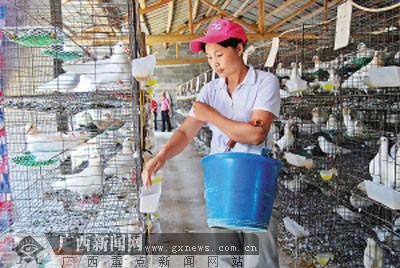 宜州市洛西镇福田村村民覃春梅(如图)在外打工学得一手养鸽技术,她引进优良品种的美国王鸽回家乡创业,仅今年上半年已向市场提供了3000多对种鸽,收入10多万元,带动村民们掀起了养鸽热潮,使该村成为当地小有名气的养鸽基地,饲养肉鸽多达6000对。 张声绮/摄