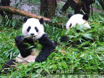 两只熊猫,两只熊猫,真可爱!真可爱!一只大啃竹秆,一只大咬竹叶,真可爱!邱凌摄