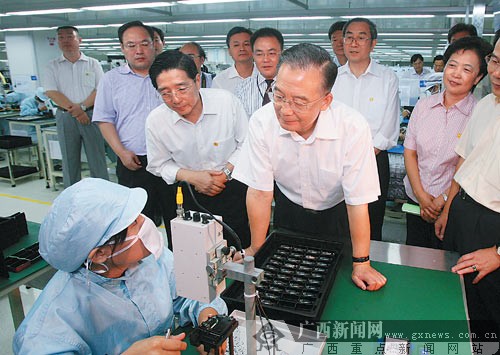 10月4日,中共中央政治局常委、国务院总理温家宝在自治区党委书记、自治区人大常委会主任郭声琨,自治区主席马飚和自治区党委副书记、秘书长陈际瓦等陪同下,深入北海永昶科技电子有限公司激光头生产线详细了解企业生产经营情况。 记者 刘 宇/摄