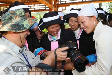 一群蓝靛瑶妇女正在观看一位摄影师拍摄的她们的照片。记者 邓昶摄