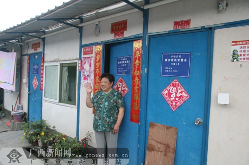 经过一户房的时候,记者看到这样一位老人,倚在门前,冲着我们微笑。我上前打了招呼,得知老人名叫徐青,都江堰人。记者参观了她和老伴居住的板房,大约16平米,中间一幅帘子隔出了卧室和客厅。有冰箱和一些家具。我问了徐青最近的生活情况,徐青笑笑说还不错。原来,徐青在地震中不仅失去了家,还失去了儿子和儿媳。幸运的是,孙子华西还在,19岁了,目前在成都上学。徐青向我说这些的时候,脸上依旧带着笑意,但却伴有泪水。送我们出门的时候,老人倚在门边,不停地挥手,我举起相机,把这一刻定格成永恒。