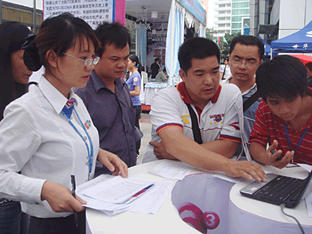 5月17日是世界电信日,中国移动广西公司除了在公司总部设有移动信息体验厅外,在户外也设点对TD网络技术进行宣传。在南宁市万达广场,记者在现场看到,这里展示的是基于中国移动TD网络的无线宽带上网业务。在3G时代,客户通过TD无线宽带业务所得到的上网速率最高可到达2.8M,客户可以通过笔记本电脑加TD上网卡的方式实现随时随地无线上网。这项业务今天在南宁开始接受客户的购机预约。许多市民现场打开网页感受TD上网的速度。市民李先生在体验了TD上网后说,中国移动今天展示的G3笔记本设计得轻便小巧,非常适合商务人士、经常出差的办公人员或者学生等群体使用,不用网线连接,也不用TD上网卡就可以无线上网,他认为非常适合自己工作使用,李先生在现场立即与中国移动签订了G3业务的上网本受理单。