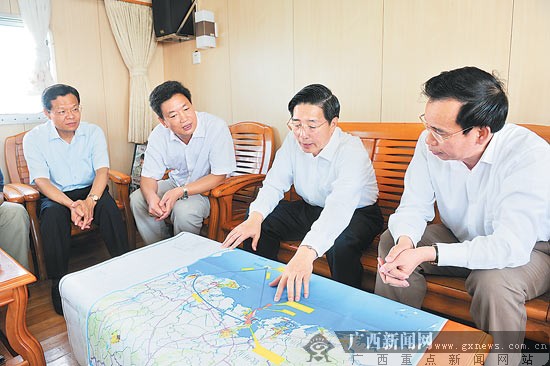 7月22日,自治区党委书记、自治区人大常委会主任郭声琨乘船出海,实地考察北部湾港钦州港区码头和航道建设情况,解决北部湾经济区开放开发中遇到的困难。 记者 刘 宇/摄