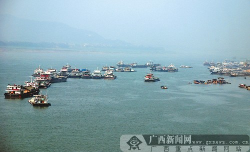 9月25日,约有几十艘货船聚集停泊在梧州河东防洪堤对出的西江河面的船只锚泊区域。目前,西江水位偏低,使得西江通航能力大受影响,吃水深度超过2.3米的船舶只能停泊等待通航。记者吴凌平 通讯员 蒙绍松/摄