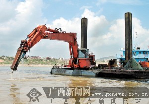 11月11日,疏浚船在梧州市西江大桥附近水域对西江航道水下礁石进行液压破碎。为了加快疏浚航道,梧州港航部门调集30多艘机械疏浚船,对全长24公里的长洲水利枢纽坝下至广东封开交界的界首段航道进行日夜施工。据悉,这一河段的疏浚工程年底前完成。记者吴凌平 通讯员颜桂海/摄