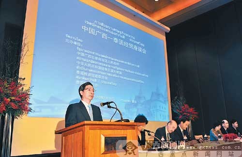 1月15日上午,广西-泰国经贸座谈会在曼谷举行。自治区党委书记、自治区人大常委会主任郭声琨向各位泰国企业家发出投资邀请,共享广西发展新机遇。记者 刘宇摄
