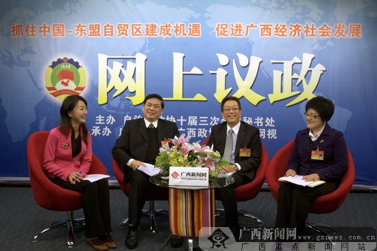 广西新闻网1月29日讯(记者覃雄)2010广西“两会”持续升温。1月29日上午10时,一场以“抓住中国-东盟自贸区建成机遇,促进广西经济社会发展”为主题的政协委员网上议政活动在广西新闻网演播厅展开。自治区政协常委,民革广西区委副主委,南宁市政协副主席唐济武,自治区政协委员,香港培力集团董事长陈宇龄,自治区政协委员,全国工商联女企业家商会执行会长、广西总商会副会长、梧州中恒集团董事长兼总裁许淑清作客广西新闻网,畅所欲言。[详细]