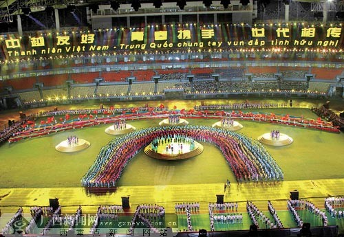 当晚,2010年中越青年联欢晚会《青春·友谊之歌》举行带妆彩排。晚会现场中央,搭起了6个铜鼓形的舞台,象征中越两国建交60周年,3000多名大学生群众演员身着艳丽服装从四周涌入场地,围在“铜鼓”周围,组成“友谊之树”等图案。晚会分《迎宾会鼓》、《友谊之源》、《青春之花》、《传承之光》、《踏歌起舞,拥抱明天》5个篇章,围绕着“共叙友谊,开创未来”的主题,节目层层推进,在一轮又一轮欢乐的人浪中,歌海情潮一浪又一浪地澎湃,让人振奋,令人流连。