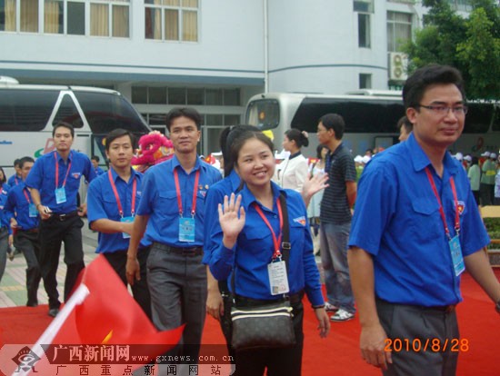广西新闻网南宁8月28日讯(实习生 梁纹嘉)8月28日上午10点,广西医科大学在该校喷泉广场上举行了隆重的欢迎仪式,欢迎来自中越青年大联欢越南青年代表团的300多名青年代表。身着绿衣的中国青年学生手中挥舞着中越两国国旗,用热烈的欢呼声欢迎越南青年代表的到来。