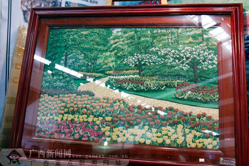 缅甸玉器远近闻名,每年的博览会都少不了缅甸玉石的展位。记者在本届博览会却发现一个特别的缅甸玉器宝石展位,这里有用玉石、珠宝、贝壳等材料制作的立体装饰画,宝石自然而瑰丽的颜色使制作出来的立体画尤为赏心悦目。
