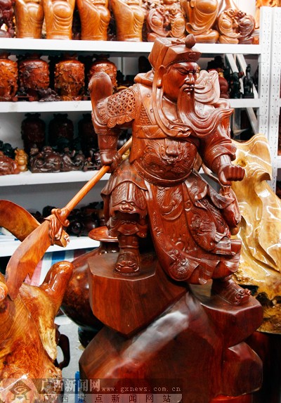 在博览会5号馆越南展馆内,记者发现不少展销红木的展位有关公造型的红木制品出售。关公是中国家喻户晓的神将,被后人推举为“忠”、“信”、“义”、“勇”集于一身的道德楷模,深受民众推崇。可是越南的红木制品为何也“钟意”关公题材呢?记者带着疑问和一名红木展商聊了起来。据该展商说,关公在越南也很受当地人民的崇敬与喜爱,而且关公像制品在中国的销售很好,因此在博览会上,他们准备了这样的摆件。据了解,一尊1米1高的“关公”红木摆件售价为一万八千元。