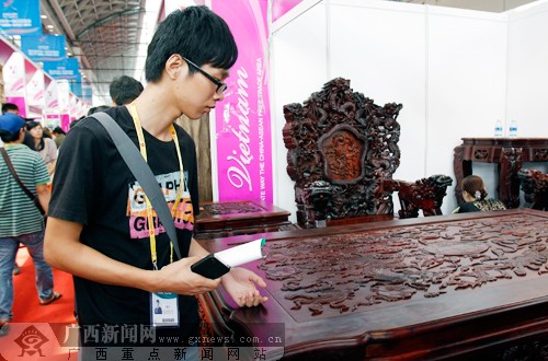红木家具历来深受消费者欢迎,越南的红木家具更是市场上的畅销产品。记者在博览会越南馆看到一套“霸气外露”的红木家具,不少客商上前仔细观摩。一名年长的专业观众细心地查看了这套家具,向展商询问价格,展商开价160万元人民币。长者并未对这样的天价做出惊奇地反应,还竖起大拇指称这套家具很好。