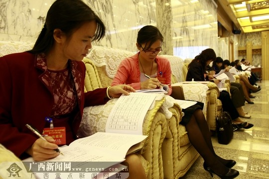 柳州市代表团在讨论。广西新闻网记者 伍永志摄