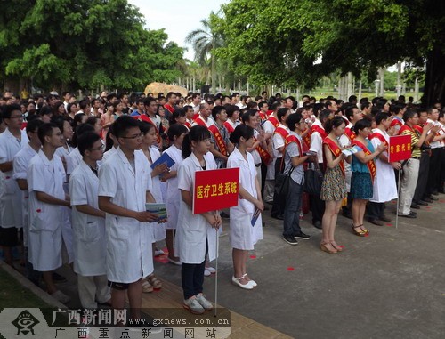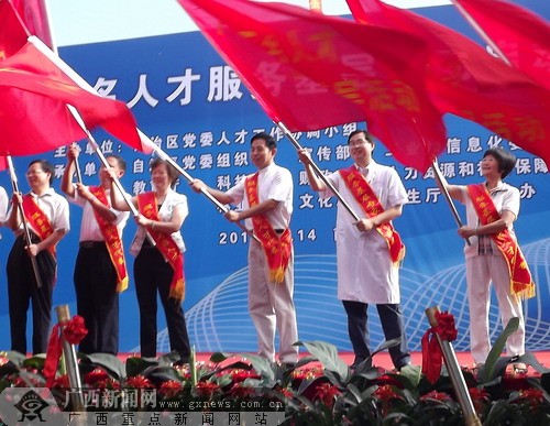 即将赴基层展开服务的人才举旗待发。广西新闻网记者 杨郑宝摄