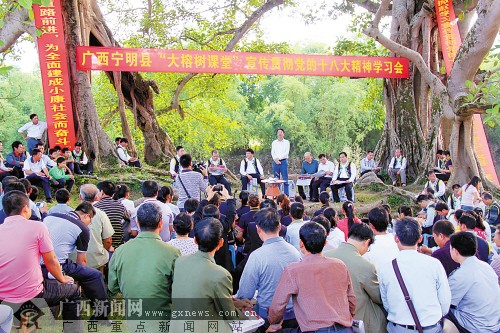 11月9日,宁明县组织广大党员干部群众在“大榕树课堂”开展学习宣讲十八大精神活动。干部群众通过讨论胡锦涛同志所作的十八大报告、抒发感想等方式,纷纷表示要结合自身实际,将十八大精神切实贯彻到具体工作中,努力开创各项工作的崭新局面。周贻刚 严 丽/摄