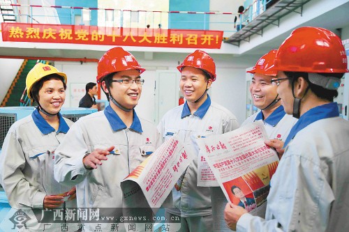 11月9日,大唐中平水力发电厂职工相聚在厂房活动室,学习十八大报告。大家纷纷表示,要认真学习、深刻领会、贯彻落实党的十八大精神,结合本职工作,以崭新的精神风貌、优异的工作成绩,为经济建设又好又快发展作出应有的贡献。记者 蒋光意 黄耀高/摄