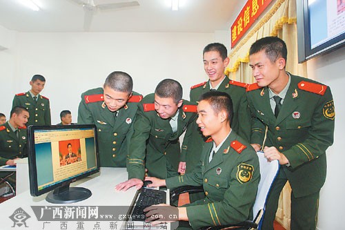 连日来,武警广西总队官兵利用报纸、广播、电视、网络等各种媒体,积极学习十八大精神,进一步坚定了信党爱党跟党走的信念。 卢佳庭/摄