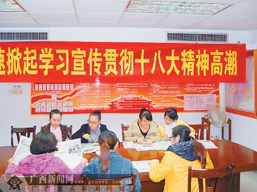 11月13日,南宁市劳动就业中心党支部组织青年党员学习胡锦涛同志在十八大报告中关于“全党要关注青年、关心青年、关爱青年,支持青年创业”的重要论述,表示要学好十八大精神,为推动实现南宁更高质量的就业再立新功。黎金球 唐伟顺/摄